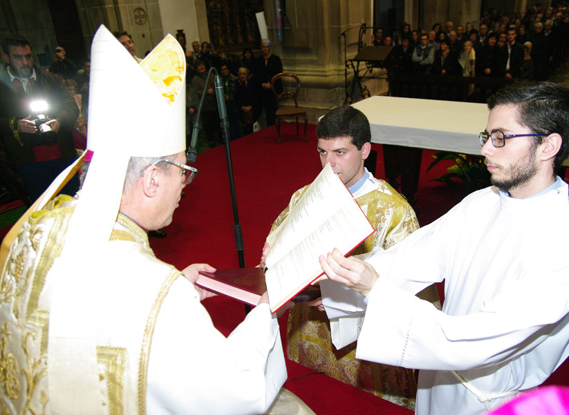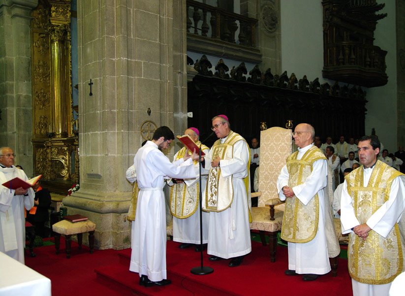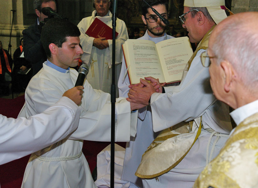 5. Caríssimo Eleito para a Ordem dos Diáconos. Bem sabes que o teu modelo e a tua referência de vida é este Senhor, que é o Amor em pessoa, que veio para o meio de nós, para nos servir e nos salvar. Bem sabes também, em consequência, que a «tua missão é ajudar o Bispo e o seu presbitério no serviço da Palavra, do Altar e da Caridade» (Pontifical Romano, Ordenação dos Diáconos, n.º 199), e que o teu distintivo é o Evangelho de Cristo que hoje vais solenemente receber, e que tens a missão de proclamar, acreditar, ensinar e viver (Pontifical Romano, Ordenação dos Diáconos, n.º 210). Recordo-te ainda, caríssimo Eleito, que o anúncio do Evangelho é «a primeira caridade» para o mundo (Exortação Apostólica Evangelii Gaudium [2013], n.º 199; Exortação Apostólica Novo millennio ineunte [2001], n.º 50), e que também nunca deves esquecer, como bem lembra o Evangelho de hoje, que só «a caridade das obras garante uma força inequívoca à caridade das palavras» (Novo millennio ineunte, n.º 50).