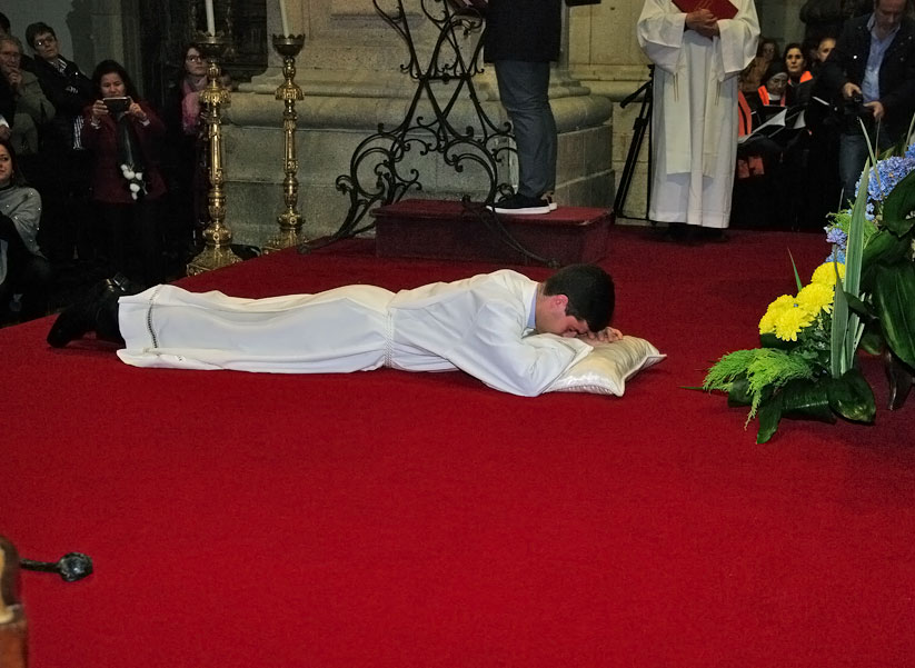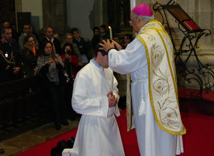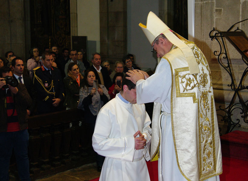 4. A graça de uma Ordenação Diaconal, no Dia da Dedicação desta Casa-mãe e no Dia de Cristo-Rei, que é o único rei que não reina desde fora, portanto não reina com a espada, com a força, decretos e impostos, mas desde dentro, portanto com mansidão, graça, amor, justiça, verdade e paz, empresta à nossa reunião celebrativa de hoje a nota do serviço humilde e dedicado que todos, como filhos e irmãos, devemos uns aos outros. Não nos podemos esquecer que o Rei do Evangelho de hoje não ostenta cetro nem coroa, mas a Cruz e o amor; não vem de Jerusalém e da sua rigidez cultual e religiosa, com o machado aos ombros e a pá de joeirar nas mãos, de acordo com o cenário desenhado por João Batista, para cortar e limpar já e em força (cf. Mateus 3,10.12). Cortar as árvores que não dão fruto, e limpar a sua eira da palha e do lixo. Para muito espanto de João Batista, eis que o Messias esperado vem da Galileia dos pagãos, e não da judaica Jerusalém, e não vem para batizar, mas para ser batizado! É notória a atrapalhação de João Batista, que ao ver este Messias que vem com um colorido tão diferente do que ele imaginava, ainda desabafa soletrando as palavras: mas não era assim… (cf. Mateus 3,14). Mas também os discípulos de Jesus de ontem e de hoje, nós também, continuamos a pensar mais ou menos da mesma maneira, pois lá vamos continuando a propor, cheios de boa vontade com certeza, arrancar já a cizânia do meio do trigo (cf. Mateus 13,28). Mas, sempre com muito espanto nosso, o dono do campo diz que não (cf. Mateus 13,29), e propõe a mansidão e a boa e bela convivência entre todos, entenda-se, o tempo da evangelização que precede sempre o fim (cf. Mateus 24,14), apondo pausa e bemol aos nossos impacientes cenários, aparentemente lógicos, do já e em força (cf. Mateus 13,24-30.36-43).